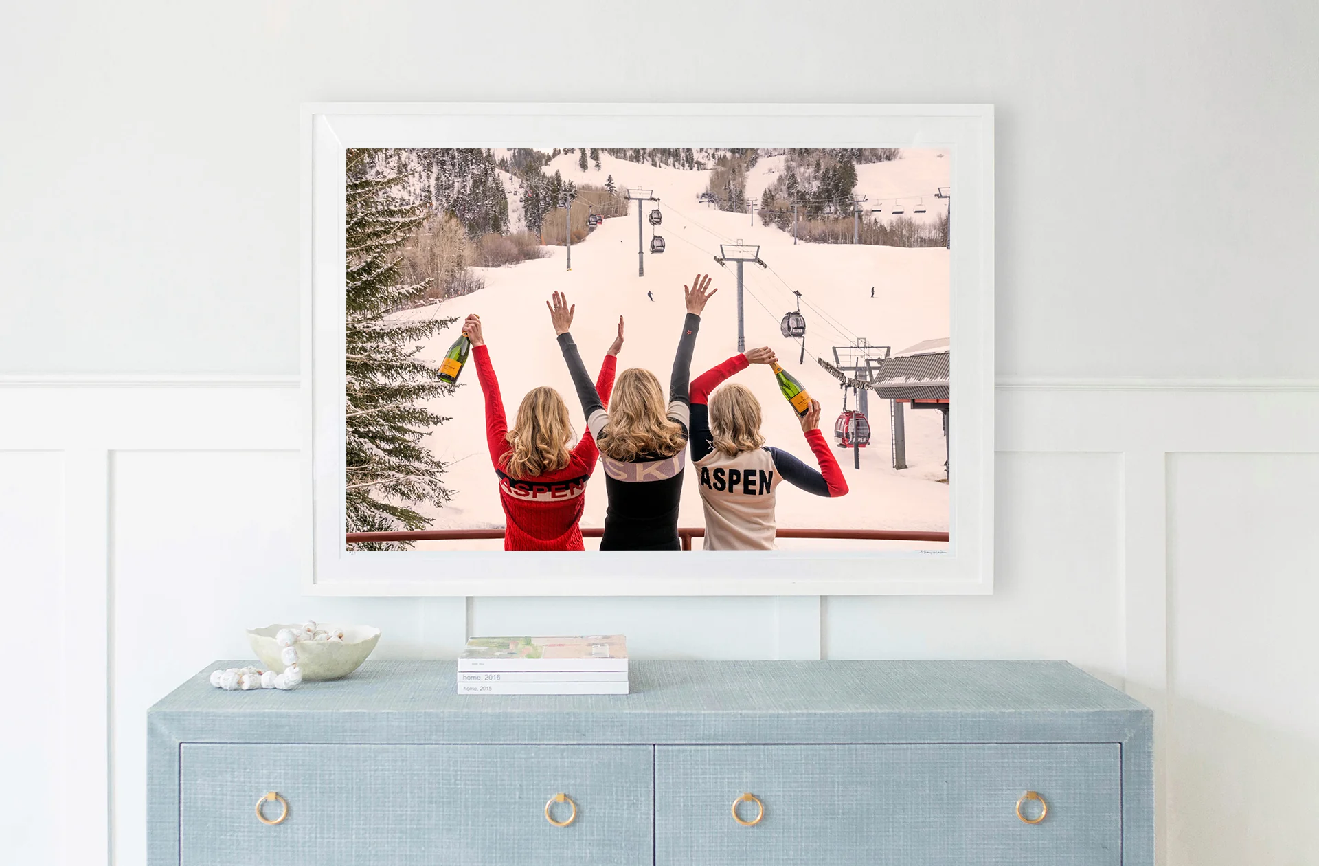 Grab the girls and celebrate a day on the slopes with some bubbly in APRÉS CHAMPAGNE, ASPEN from the Gray Malin in Aspen series.