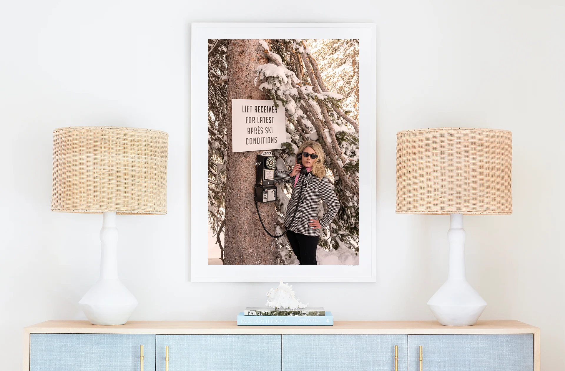 Capture the thrill of the slopes with "Apres Ski Conditions, Vail," a dynamic fine art photography print from Gray Malin's "Gray Malin in Vail" series. This artwork features a lively apres-ski goer with a vintage telephone at the mountain's peak, perfect for ski enthusiasts who love the energy of winter sports. Add a touch of alpine adventure to your space.