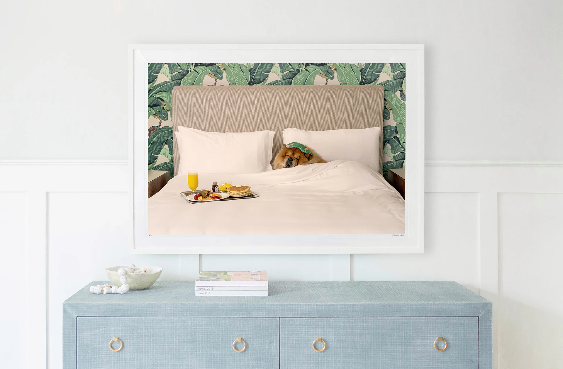Treat yourself and your furry friend, Mr. Chow, to BREAKFAST IN BED, THE BEVERLY HILLS HOTEL from Gray’s playful series, Dogs at The Beverly Hills Hotel.