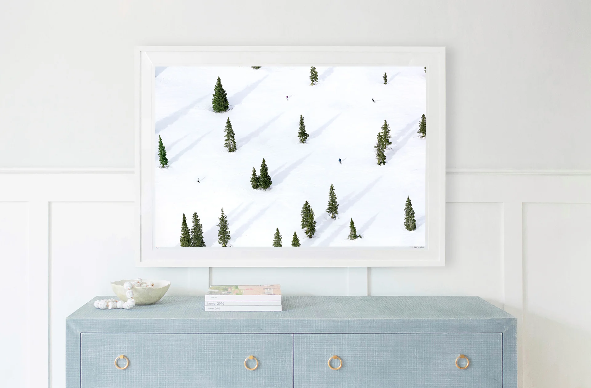 Escape to the snow-covered slopes of Colorado in HIGH ALPINE SKIERS, ASPEN. Gray's À la Montagne series, shot from doorless helicopters, captures the luxe winter bliss found at lavish ski resorts around the world from a unique aerial perspective.