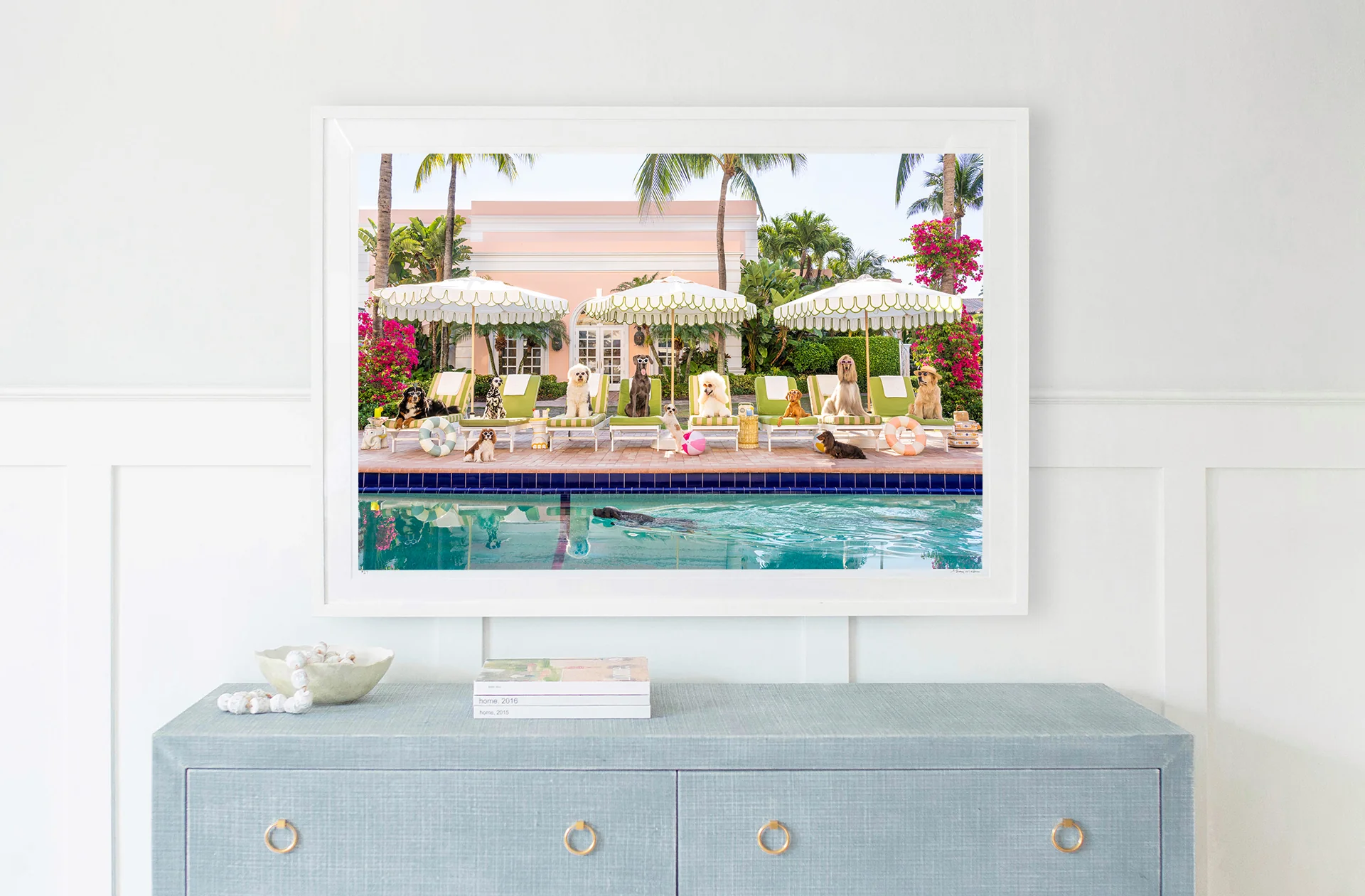 Step into a sun-soaked paradise with âPool Day, The Colony Hotel,â a captivating piece of fine art photography from Gray Malinâs âDogs of Palm Beachâ series. Featuring posh pups lounging by the iconic pool, this vibrant photograph captures the essence of a leisurely day under the Florida sun. Infuse your space with playful elegance and the carefree spirit of Palm Beach with this delightful print.